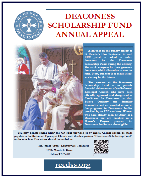 - The Sunday closest to St. Phoebe’s Day (September 3rd) shall be designated for an appeal for donations to the Deaconess Scholarship Fund throughout the Reformed Episcopal Church each year.